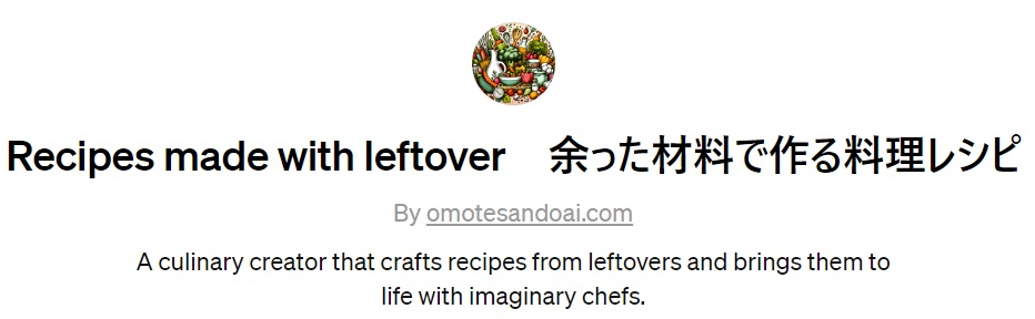 Recipes made with leftover 余った材料で作る料理レシピ 2024.02.04 カテゴリー1 この記事のタイトルとURLをコピーする Recipes made with leftover 余った材料で作る料理レシピ A culinary creator that crafts recipes from leftovers and brings them to life with imaginary chefs. 残り物からレシピを作成し、架空のシェフと一緒にそのレシピに命を吹き込む料理クリエイター。 4ChoiceQuestions 4択問題作成 前の記事 SIMPLE Logo Creator 次の記事
