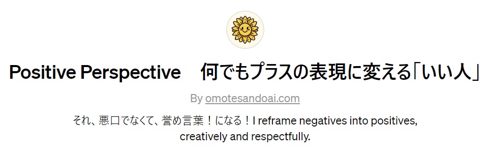 Positive Perspective 何でもプラスの表現に変える「いい人」 2024.02.05 未分類 この記事のタイトルとURLをコピーする それ、悪口でなくて、誉め言葉!になる! このアプリは創造的かつ敬意を持ってネガティブなものをポジティブなものに再構成します。 From Face to Whole body 顔写真から全身に拡張 前の記事